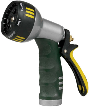 Rear-trigger 7-pattern. Heavy-duty metal construction. Patterns for all watering needs. Slip-resistant rubberized grip, trigger, and head.